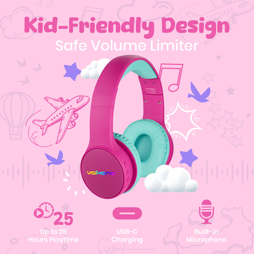 The Volkano Atlas Bluetooth Headphones are designed for safe, comfortable, and fun listening – whether it’s for school, play, or travel. With adjustable volume-limiting settings (85dB & 95dB), these headphones help protect your child’s hearing while delivering crisp, clear sound. With up to 26 hours of wireless playback and soft cushioned earcups, they can enjoy extended listening in total comfort. The built-in mic supports calls and online learning, while the wireless Bluetooth design gives them the freedom to move. Backed by the trusted Volkano brand, these headphones are the perfect blend of safety, comfort, and functionality. Feature Highlights Safe Volume Limiting – Protects young ears with 85dB & 95dB modes Bluetooth Wireless Freedom – No cables, just easy movement and pairing Up to 26 Hours Playtime – Great for long trips, school, or home use Cushioned Comfort – Soft earcups and headband Built-In Mic for Calls – Ideal for voice chats or virtual classes Wired Option Included – Use the 3.5mm jack if battery runs low Technical Specifications Chipset: JL Sensitivity: 85 ±3dB / 95 ±3dB Battery: 250mAh Charging Input: 5V, 180mA Playback Time: Playtime(50% Volume at 85dB, Light Off): 26 Hours Playtime(100% Volume at 85dB, Light Off): 25 Hours Playtime(50% Volume at 85dB, Light On): 9.2 Hours Playtime(100% Volume at 85dB, Light On): 8.5 Hours Playtime(50% Volume at 95dB, Light Off): 24 Hours Playtime(100% Volume at 95dB, Light Off): 23 Hours Playtime(50% Volume at 95dB, Light On): 9 Hours Playtime(100% Volume at 95dB, Light On): 8 Hours What’s in the Box Volkano Atlas Bluetooth Padded Headphones with dB Switch Function USB-C Charging Cable 3.5mm Audio Jack Cable Instruction Manual Let your kids listen safely, comfortably, and wirelessly with the trusted quality of Volkano. Safe Volume Mode Switching – 85db & 95dB Up to 25-Hour Battery Life Wireless Bluetooth Convenience Soft, Cushioned Earcups Built-In Mic for Easy Calls