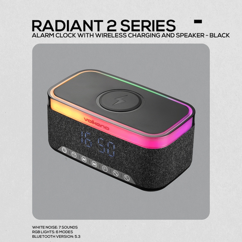 Wake up in style and stay connected with the Volkano Radiant 2 Alarm Clock Bluetooth Speaker with Wireless Charging. Combining modern convenience with powerful sound, this multifunctional bedside companion is designed to simplify your lifestyle.