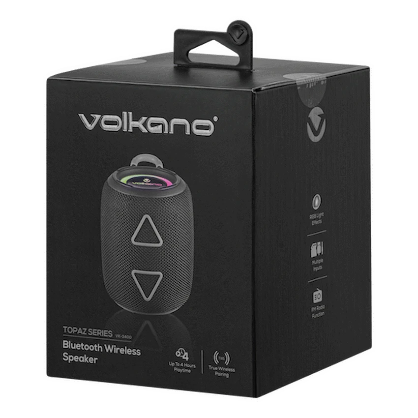 Volkano Topaz Series Bluetooth Speaker – Black Up to 4 hours playtime FM Radio TWS Pairing RGB Lights Mulitple Inputs