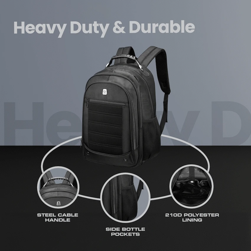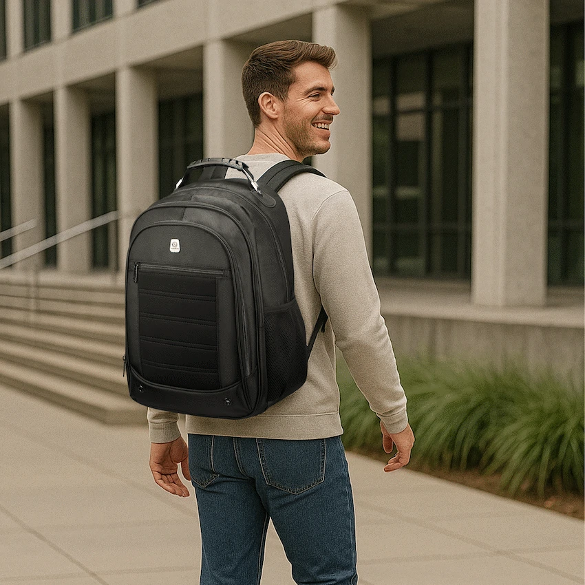 A high-quality laptop backpack with a padded compartment that fits laptops up to 15.6”. Multiple internal and external pockets provide ample storage for organizing chargers, cables, power banks, keys, wallets, water bottles, notebooks, documents, and other daily essentials. Made with durable, water-resistant materials and reinforced stitching for long-lasting use. Features adjustable padded shoulder straps, breathable back padding, a top handle for carrying, side handles for easy lift, and a secure zipper closure for added protection during travel or daily use.