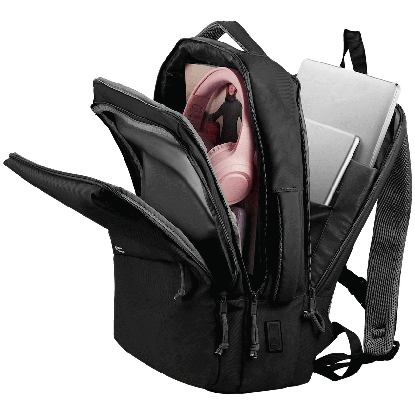 A high-quality laptop backpack with a padded compartment that fits laptops up to 15.6”, designed to accommodate all your business and overnight packing needs, whilst fitting neatly under the seat in front of you on an aeroplane. Multiple internal and external pockets provide ample storage for organizing chargers, cables, power banks, keys, wallets, water bottles, notebooks, documents, and other daily essentials. Made with durable, water-resistant materials and reinforced stitching for long-lasting use. Features adjustable padded shoulder straps, breathable back padding, a top handle for carrying, side handles for easy lift, and a secure zipper closure for added protection during travel or daily use. Large Capacity Water-resistant outer fabric 3 main compartments 17.3” Laptop compartment Large compartment for overnight goods Wet & Dry compartment USB Charging port Wide & padded shoulder straps Ultra padded & breathable back Adjustable chest clip