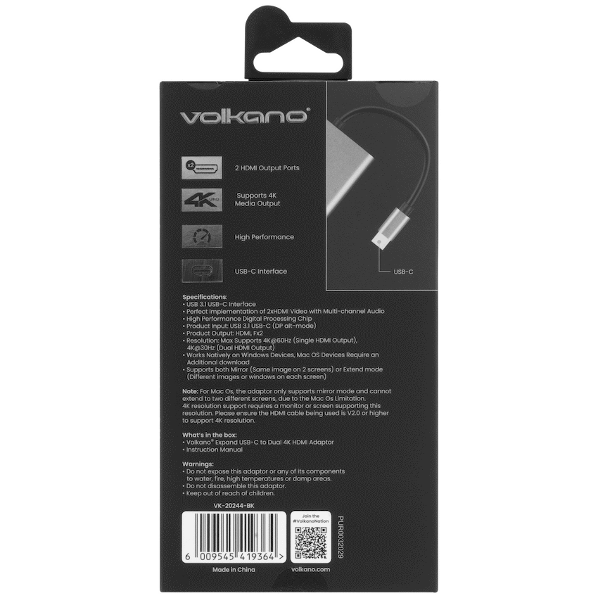 Take your workflow to the next level with the Volkano Expand Series USB‑C to Dual 4K HDMI Adaptor. This precision-engineered accessory lets you connect two HDMI displays to your USB‑C device using DisplayPort Alternate Mode, delivering crystal-clear visuals at ultra-high-definition. Whether you’re editing, streaming, or multitasking, it enables both mirrored and extended display modes without extra software—just plug in and go.