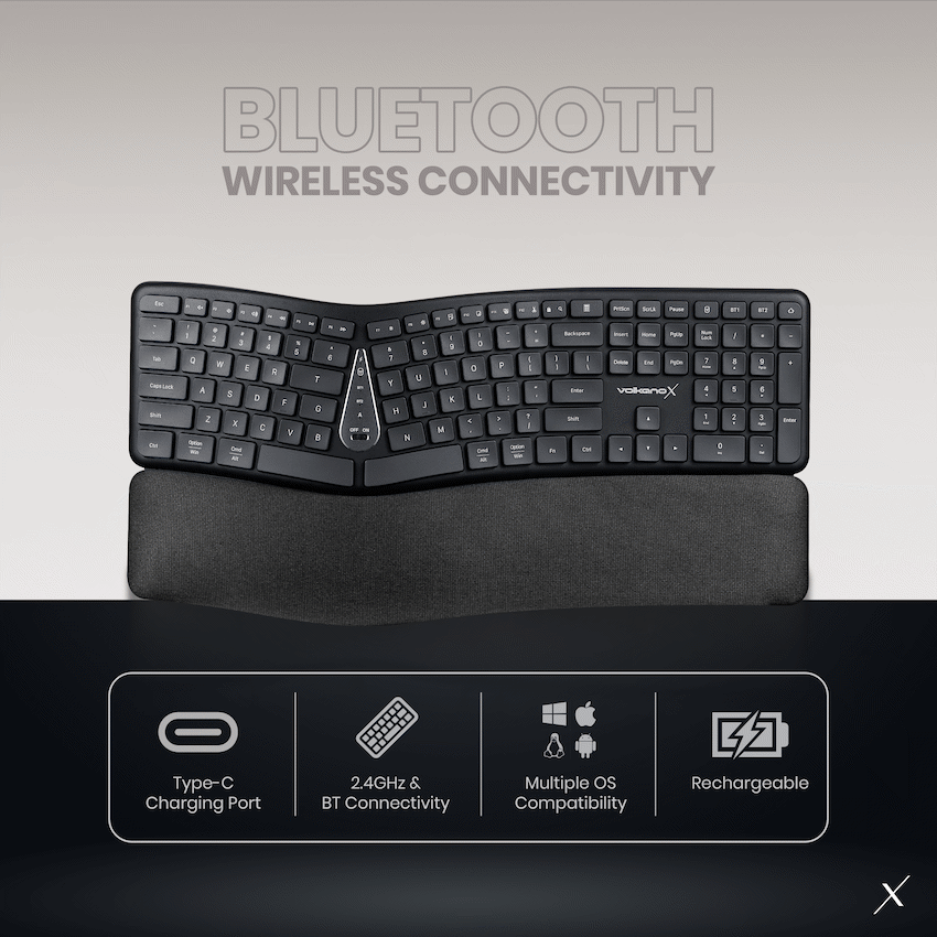 Upgrade your workspace with the VolkanoX Ergo Bluetooth Wireless Keyboard, engineered for comfort, versatility, and productivity. Featuring Bluetooth + 2.4GHz connection, this keyboard gives you the flexibility to connect to virtually any device—whether it’s a laptop, desktop, tablet, or smart TV. Enjoy smooth performance and clutter-free setups with universal OS compatibility across Windows, macOS, Linux, and Android.