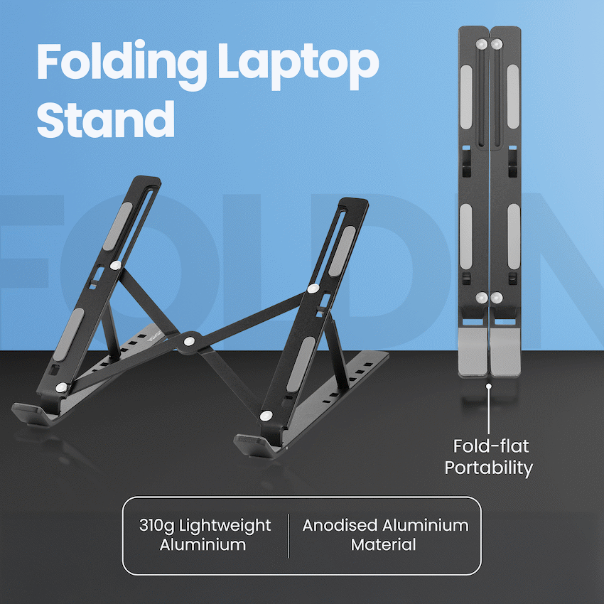 Work more comfortably with the Volkano Chill Series Aluminium Folding Laptop Stand (VK‑8147‑BK). This sleek, anodised aluminium notebook stand lifts your laptop for better posture—helping reduce neck and shoulder strain—and improves ventilation to prevent overheating. It’s foldable, portable and ideal for use at home, the office, cafés or on the go. Designed for flexibility, it offers angle adjustments between 15° and 40°, allowing you to set the screen to a height that suits your eyesight. When not in use, it folds flat to a compact size (≈ 44 × 13 × 253 mm), so it fits easily in your laptop bag. Includes non‑slip pads to hold your gear securely and a soft velour carry pouch for protection and easy transport. Folding laptop stand • Folded Size: 44 x 13 x 253 mm • Expanded Size: 253 (L) x 150 (H) x 184 (W) • Weight: 310 g • Product Angle Adjustment: From 15° ~ 40° • Material: Anodised Aluminiu