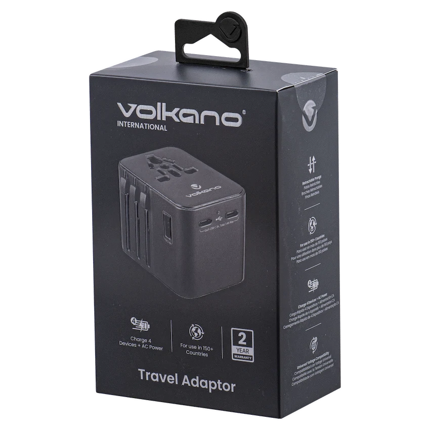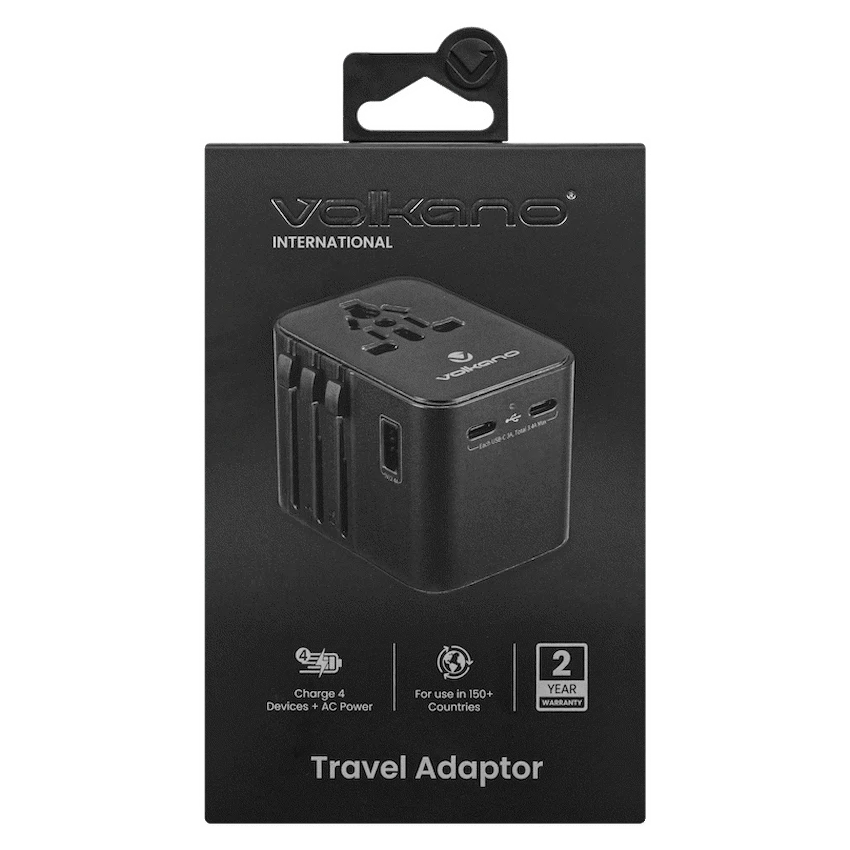 Travel with confidence using the Volkano International Series Travel Adapter — the one companion you need for plugs across the world. This adapter supports sockets in over 150 countries, letting you switch between USA, EU, UK, AUS, CH, IN, TH plug types with ease. Its built‑in safety shutters and LED power indicator give peace of mind, while dual USB‑C/USB‑A ports keep your devices powered without juggling multiple chargers.