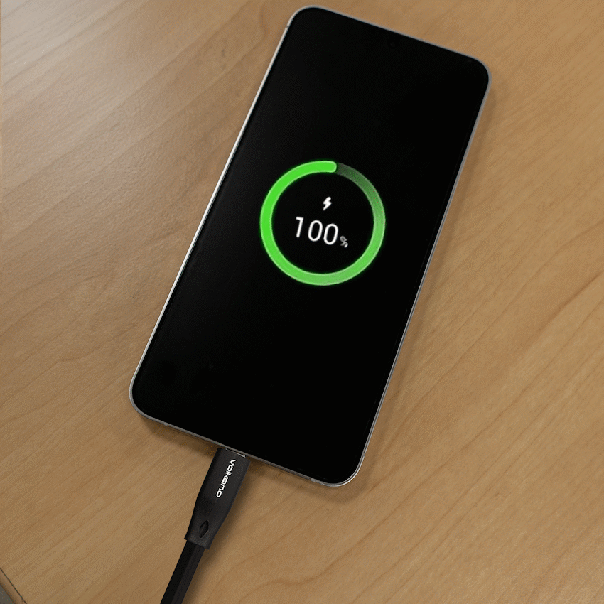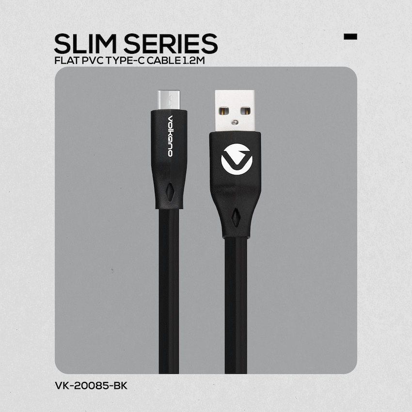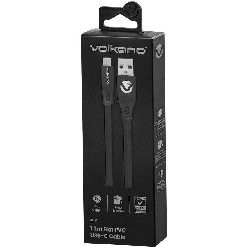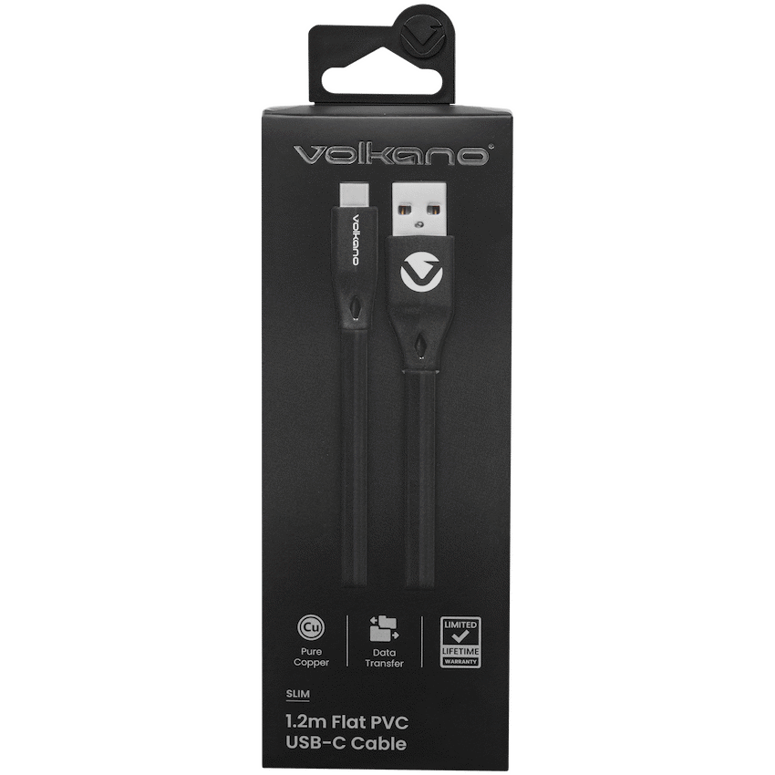 Charge and transfer data with speed and reliability using the Volkano Slim Series Flat PVC Type-C Cable. With a 1.2-meter (4-foot) length, fast charging capabilities, and high-speed data transfer, this reinforced cable is perfect for everyday use with all your USB-C compatible devices. Its flat PVC design adds durability while helping to prevent tangles.