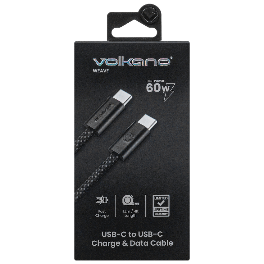 Power up and sync confidently with the Volkano Weave Series this USB-C to USB-C cable 60W. Built for modern USB-C devices, it supports PD fast charging up to 20V/3A (60W) for compatible phones, tablets and many compact notebooks, while delivering USB-C data transfer at up to 480 Mbps for photos, music and documents. The extended 1.2 m length gives you more freedom at your desk, bedside or in the car—without the clutter of overly long leads. 60W PD Fast Charging – Up to 20V/3A for reliable, high-speed power Charge & Sync in One – 480 Mbps data transfer for everyday files Extended Reach – 1.2 m length for flexible positioning Durable Build – Nylon-braided (48 ingots) jacket + aluminium-alloy ends USB-C to USB-C – Reversible connectors for hassle-free use