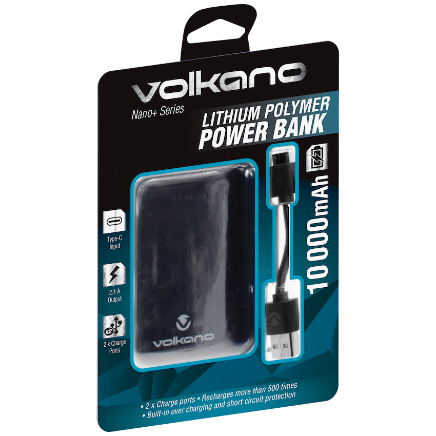 Never be caught without battery on your device ever again whether you re on the go or caught up in load shedding. The Volkano 10000mAh Nano Plus Power Bank is compact enough to comfortably fit in your pocket yet has the capacity to offer 3 full charges to your average cellphone. Features two USB charge ports, LED battery indicator and includes a charging cable.