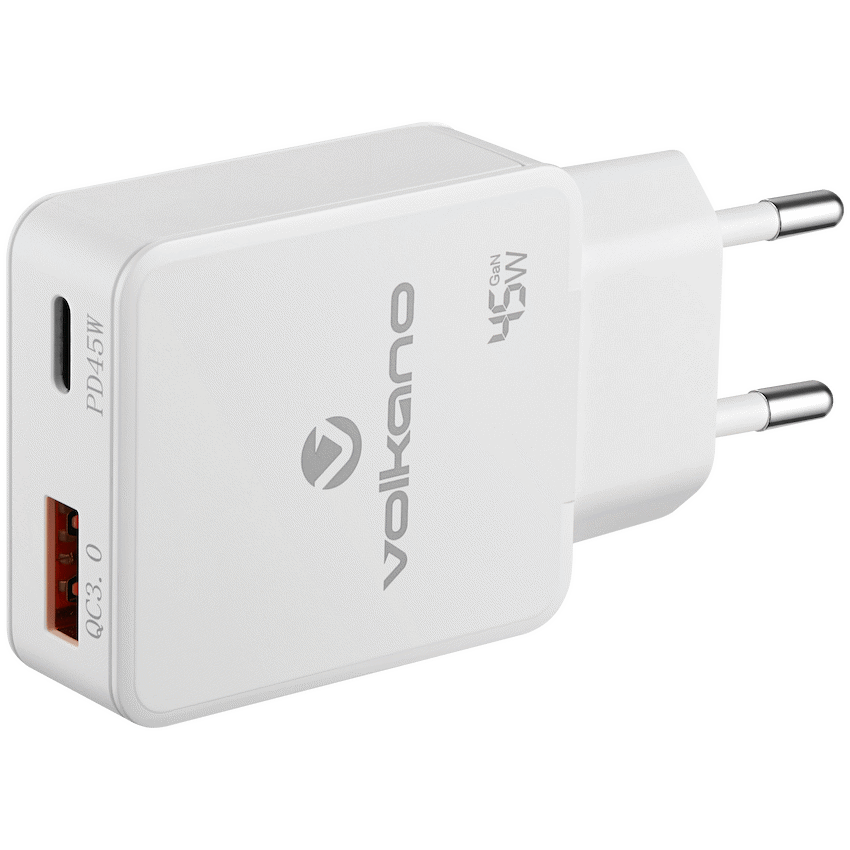 Meet the Volkano Potent Plus Series 45W GaN Compact Wall Charger — a next-generation charging solution designed for speed, efficiency, and portability. Featuring cutting-edge GaN (Gallium Nitride) technology, this compact powerhouse delivers up to 45W of high-speed charging through its USB-C Power Delivery port and USB-A Quick Charge port. Whether you’re topping up a smartphone, tablet, or lightweight laptop, this sleek dual-port charger offers smart power distribution, travel-ready versatility, and reliable performance in a remarkably small form factor. Compact GaN technology delivers superior power in a smaller size. Provides up to 45W charging. Dual-port design: USB-C PD + USB-A QC for universal compatibility. Smart power distribution: 30W + 12W shared when both ports are used. USB-C supports multiple fast charging profiles (15W to 45W). USB-A delivers up to 18W for legacy device support. Global 100-240V AC input makes it ideal for international travel. Built-in safety features protect against overheating and overvoltage.