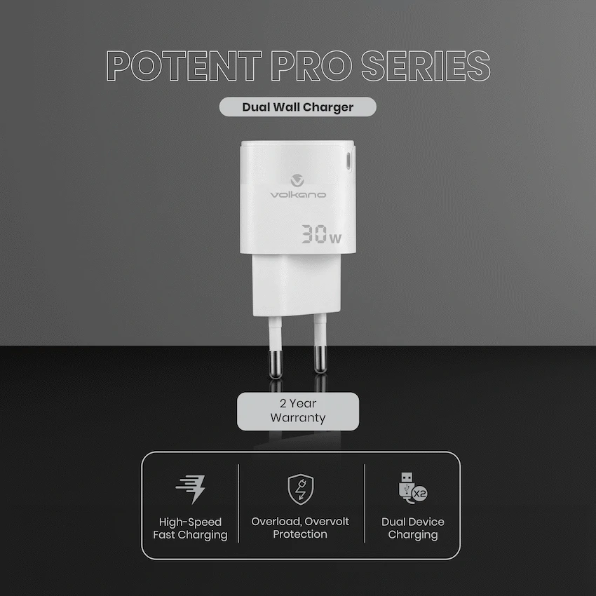 Volkano Potent Pro 30W Dual Wall Charger Dual Charging ports 30W Charger Overload and Overvolt Protection