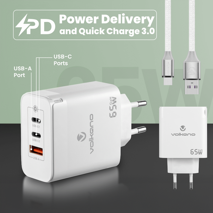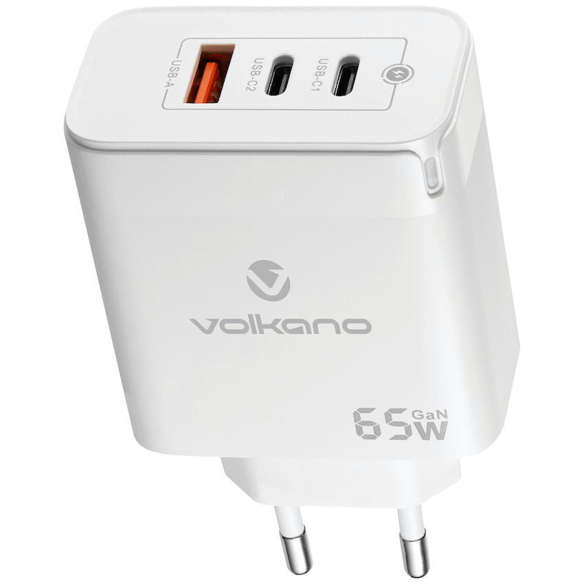 Volkano Potent Trio 65w GaN 3 Port Wall Charger 65W charger Overload and overvolt protection charge 3 devices simultaneously