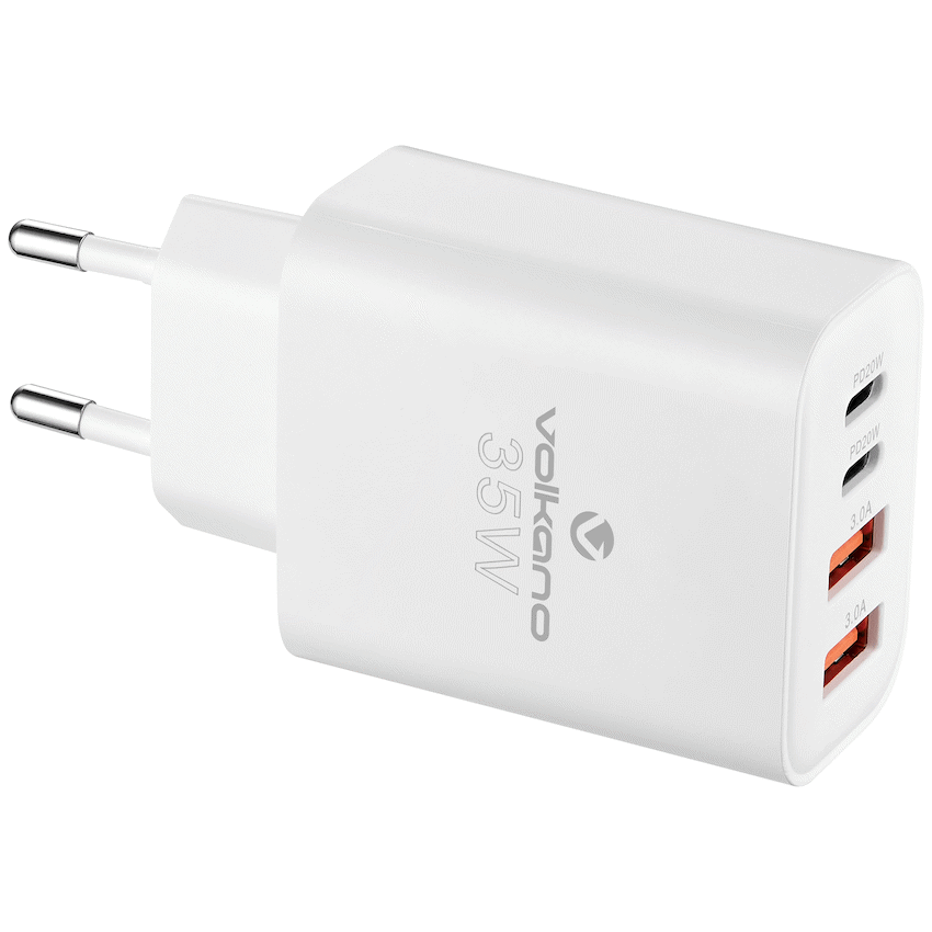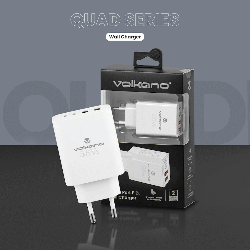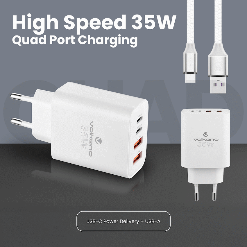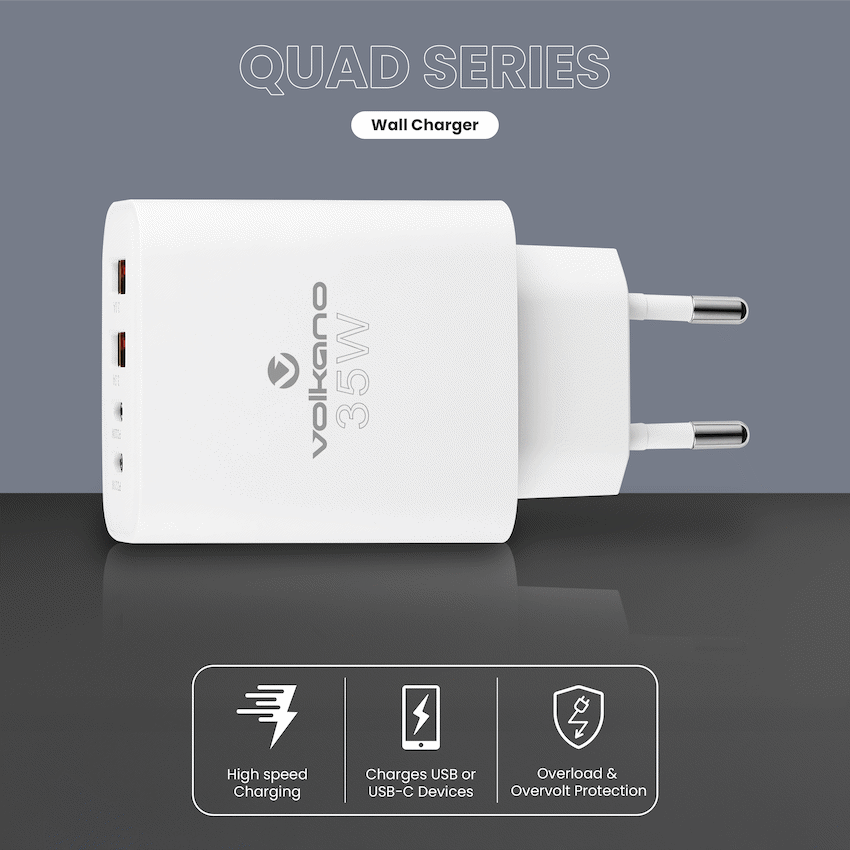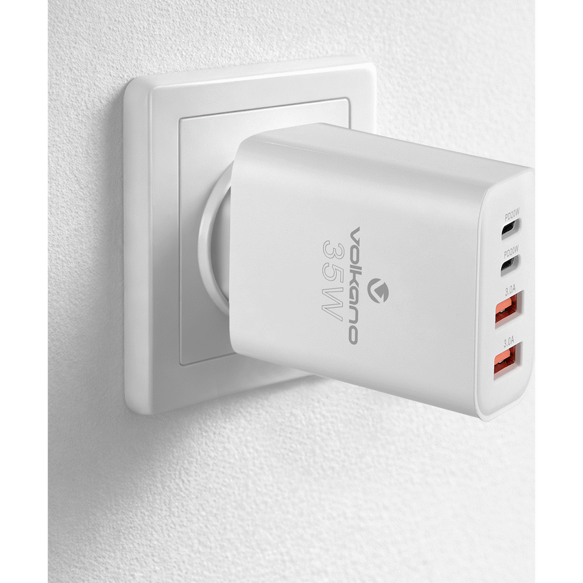 Volkano Quad Series 2*PD USB-C 2*USB-A 3A 35W Wall Charger Charge 4 Devices Simultaneously Overload and Overvolt Protection Automatic Voltage Selection High Speed Charging