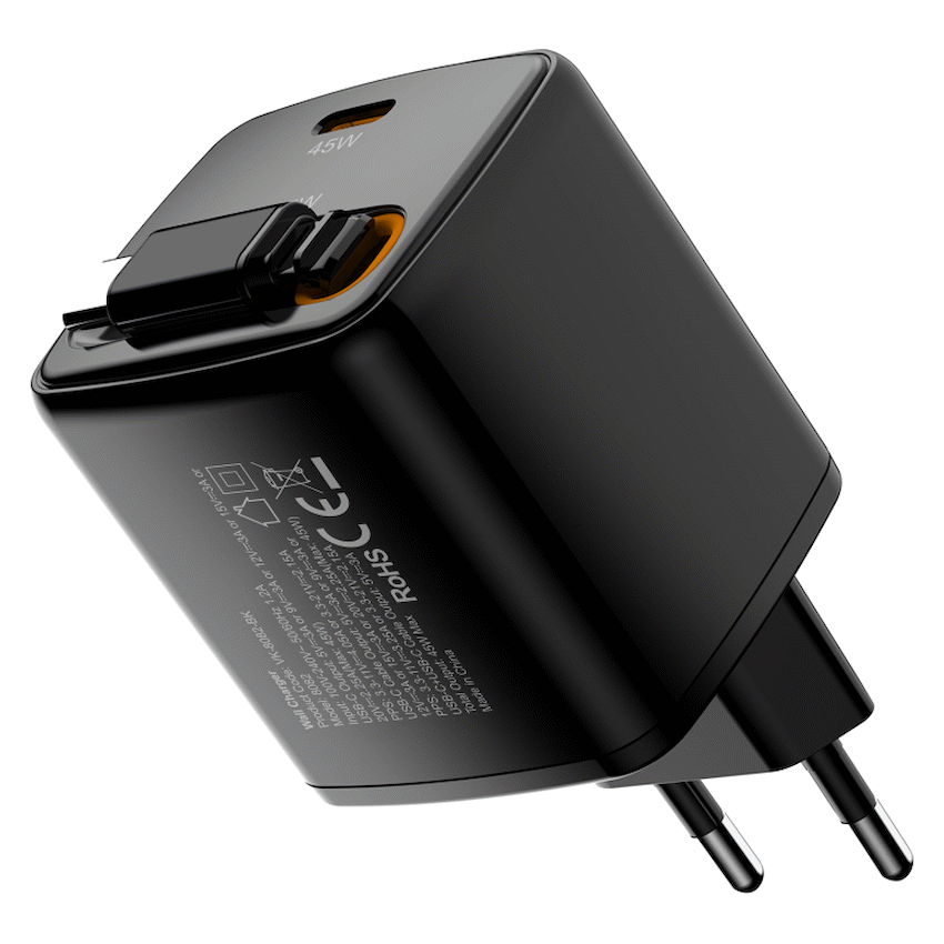 This 45W GaN charger gives you efficient, cooler-running fast charging in a compact body, plus the flexibility of a dual USB-C PD charger for phones, tablets and everyday USB-C accessories. Get up to 45W (20V/2.25A) PD on a single USB-C, or use both outputs for shared charging. With PPS fast charging (5-11V/3.25A or 5-21V/2.15A), it dynamically adjusts voltage and current on compatible devices for quicker, safer top-ups. Up To 45W USB-C PD – 5V/3A, 9V/3A, 12V/3A, 15V/3A, 20V/2.25A (45W Max) Dual USB-C Outputs – Charge two USB-C devices at once (combined 5V/3A mode) PPS Fast Charging – Adaptive 5-11V/3.25A or 5-21V/2.15A for compatible phones Retractable 75 cm Cable – Clean, tangle-free setup for desk or travel