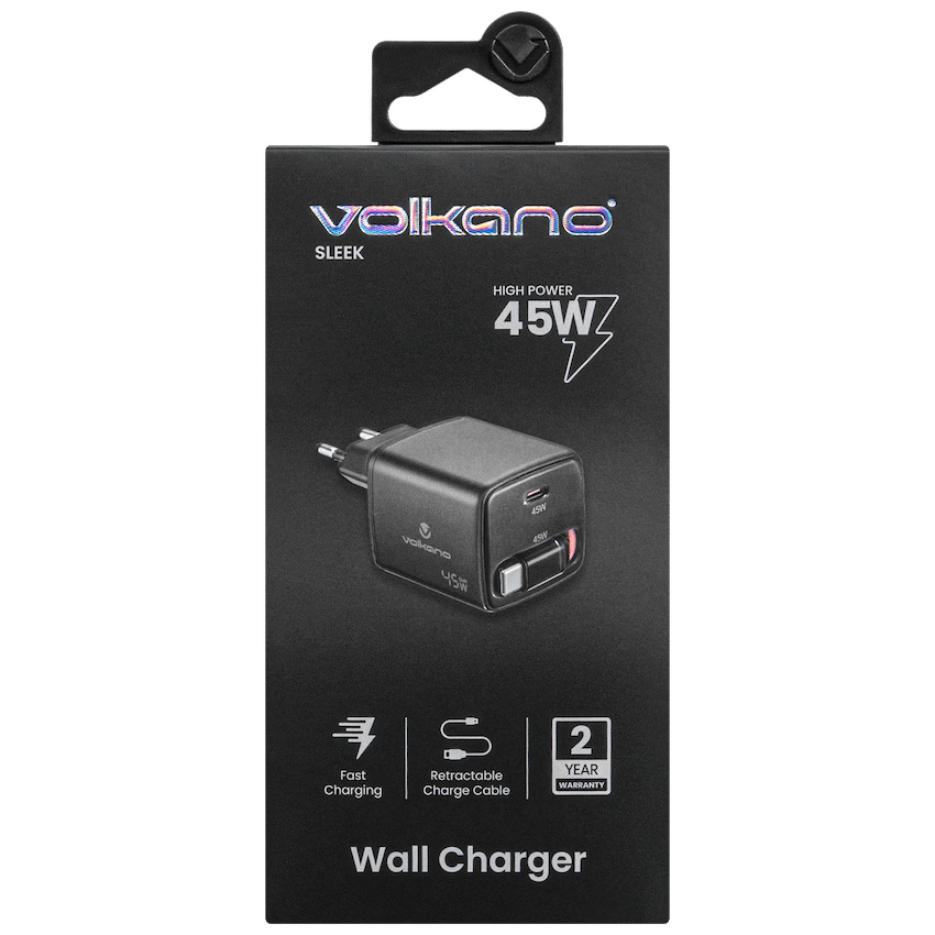 Volkano Sleek Series Fast Wall Charger 45W USB-C with Built-in Retractable 75cm Cable – Black