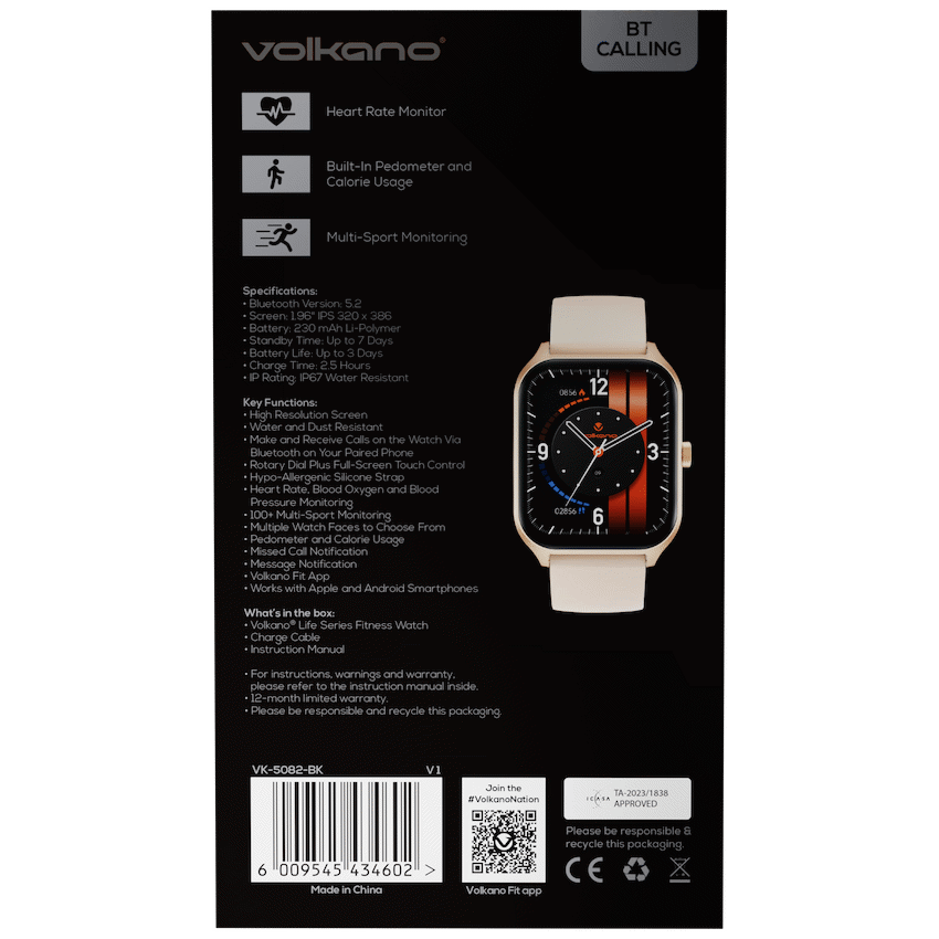 Comfort meets function with a hypo-allergenic silicone strap, and the watch pairs easily with both Android and Apple devices via the Volkano Fit App for easy syncing and fitness tracking.