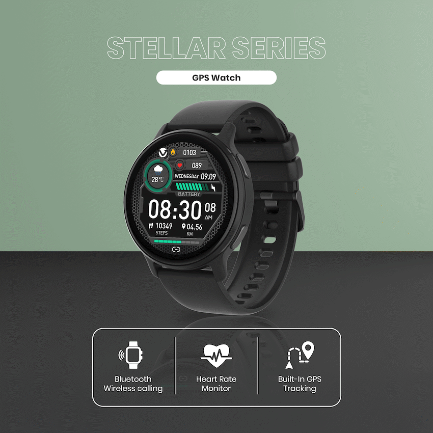 Stay in control with the voice assistant, manage your media through camera shutter and music control, and never miss an update with message and call notifications. For health and wellness, the Stellar Series monitors heart rate, blood oxygen levels, steps, and calories, giving you insights into your overall activity and wellbeing.